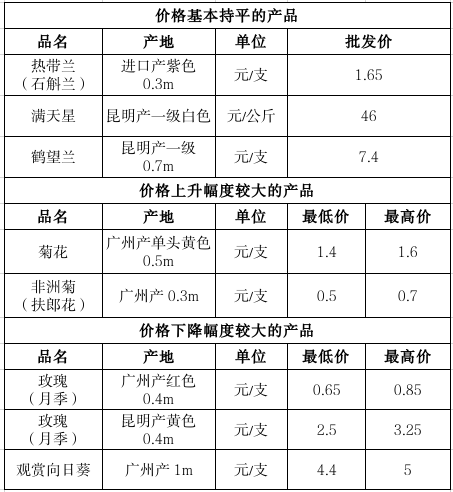 本周行情分析:本周清明节,菊花、非洲菊等品种价格上涨;玫瑰、向日葵等品种价格下滑;紫色热带兰、满天星、鹤望兰等品种价格比较稳定。