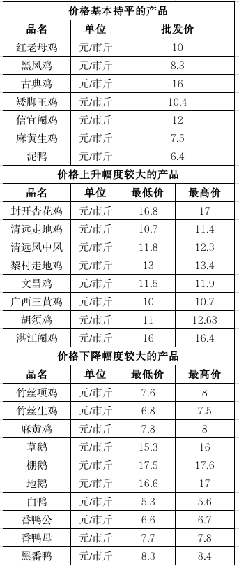本周行情分析:本周家禽价格整体保持下降。其中价格上升的品种主要有封开杏花鸡、清远走地鸡、清远凤中凤、黎村走地鸡、文昌鸡、广西三黄鸡、胡须鸡、湛江阉鸡等;价格下降的品种主要有竹丝项鸡、竹丝生鸡、麻黄鸡、草鹅、棚鹅、地鹅、白鸭、番鸭等。