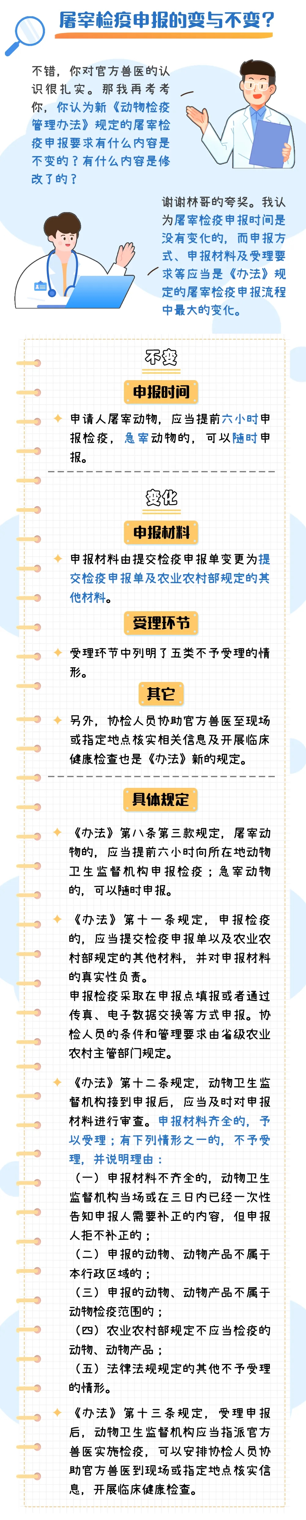 2022年12月1日起正式实施的《动物检疫管理办法》(下文简称《办法》)对强化基层动物检疫力量、优化工作机制作出了细化规定。其中动物检疫分为产地检疫和屠宰检疫,本期一同看看屠宰检疫的相关规定,新手官方兽医们尤其不能错过哦。