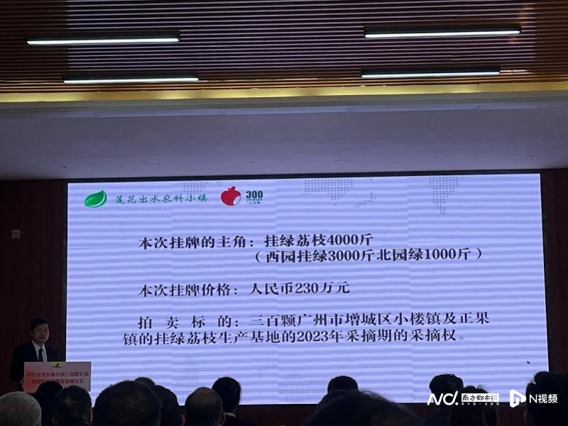 在现场莲花出水农科小镇三百颗公司荔枝采摘权挂牌路演环节,吴宇辉介绍了挂牌的价格和标定。本次挂牌的主角为挂绿荔枝4000斤,挂牌价格为230万元,拍卖标的为三百颗广州市增城区小楼镇及正果镇的挂绿荔枝生产基地的2023年采摘期的采摘权。