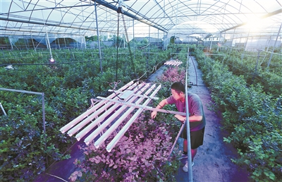 当光照不够充足时,科研人员利用人造光源的照射,促进蓝莓生长,增加蓝莓甜度