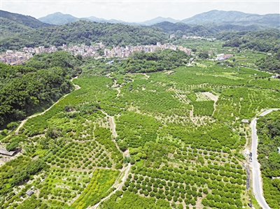 在沙田村里,葱茏翠绿的柠檬树绵延至远处山脚